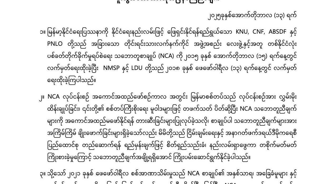 NCAလံၥ်ဃံးဃၥ်အပူၤ ကရၢတဖၣ်လၢ အဆဲးလီၤမံၤစဲပနီၣ်တဖၣ်ဒ်အမ့ၢ် ကညီဒီကလုၥ်စၢဖှိၣ်ကရၢ(KNU), ကီၢ်ပယီၤကၠိဖိဒံၣ်မိၣ်ကရံးတံးသုး(ABSDF), တလၢၤကီၢ်သီပၣ်တံၣ်(ဒုးလီၤပှီၢ်သုးမီၤစိရိၤ) (NMSP-AD), ခၠီဒီကလုၥ်သုး (CNF), ပအိးဒီကလုၥ်တၢ်ထူၣ်ဖျဲးကရၢခိၣ်ကျၢၢ်(PNLO), လါဟူးဒံၣ်မိၣ်ကရံးတံးစၢဖှိၣ်ကရၢ(LDU) ကရၢ၆ဖုတဖၣ် ပၥ်ဖှိၣ်ထုးထီၣ်ပၥ်ဖျါ၀ဲ အတၢ်ပၥ်သးဖဲ NCAပှဲၤထီၣ် အနံၣ်(၁၀)အနံၤန့ၣ်လီၤ.